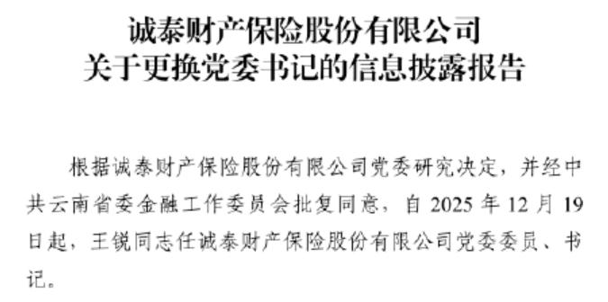 近日,诚泰财产保险股份有限公司(以下简称“诚泰财险”)发布关于更换党委书记的信息披露报告称,根据该公司党委研究决定,并经中共云南省委金融工作委员会批复同意,自2025年12月19日起,王锐任该公司党委委员、书记。