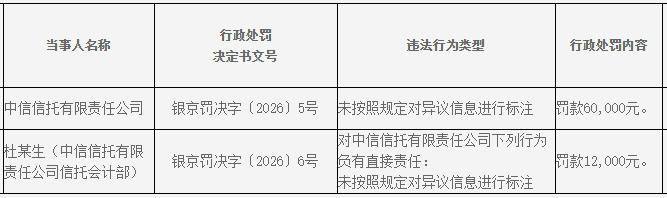 1月23日,中国人民银行北京市分行行政处罚决定信息公示表显示,中信信托因未按照规定对异议信息进行标注,被处以罚款6万元。同时,中信信托有限责任公司信托会计部杜某生因对上述违法违规行为负有直接责任,被处以罚款1.2万元。