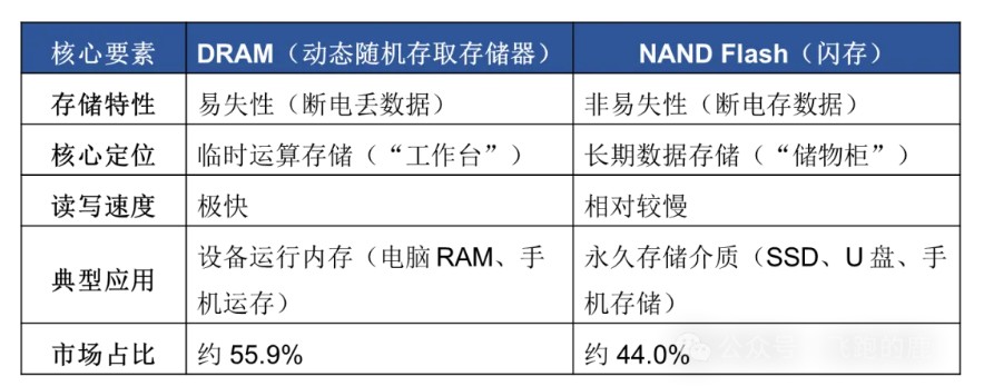 目前半导体存储市场中,DRAM和NAND Flash是主力,前者占约55.9%份额,后者占约44.0%,几乎垄断存储赛道。