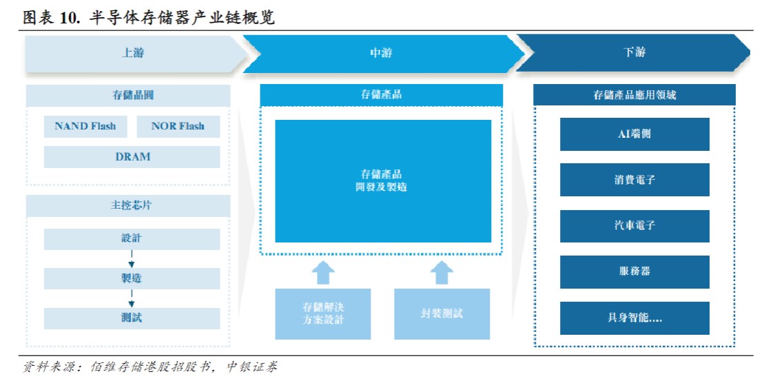 半导体存储产业链上游为行业提供存储晶圆(如NANDFlash、DRAM芯片)、主控芯片等基础资源;中游负责存储解决方案的设计、封装测试;下游应用多元,包括AI终端(如AI手机、PC、眼镜)、消费电子、智能驾驶及工业能源等。