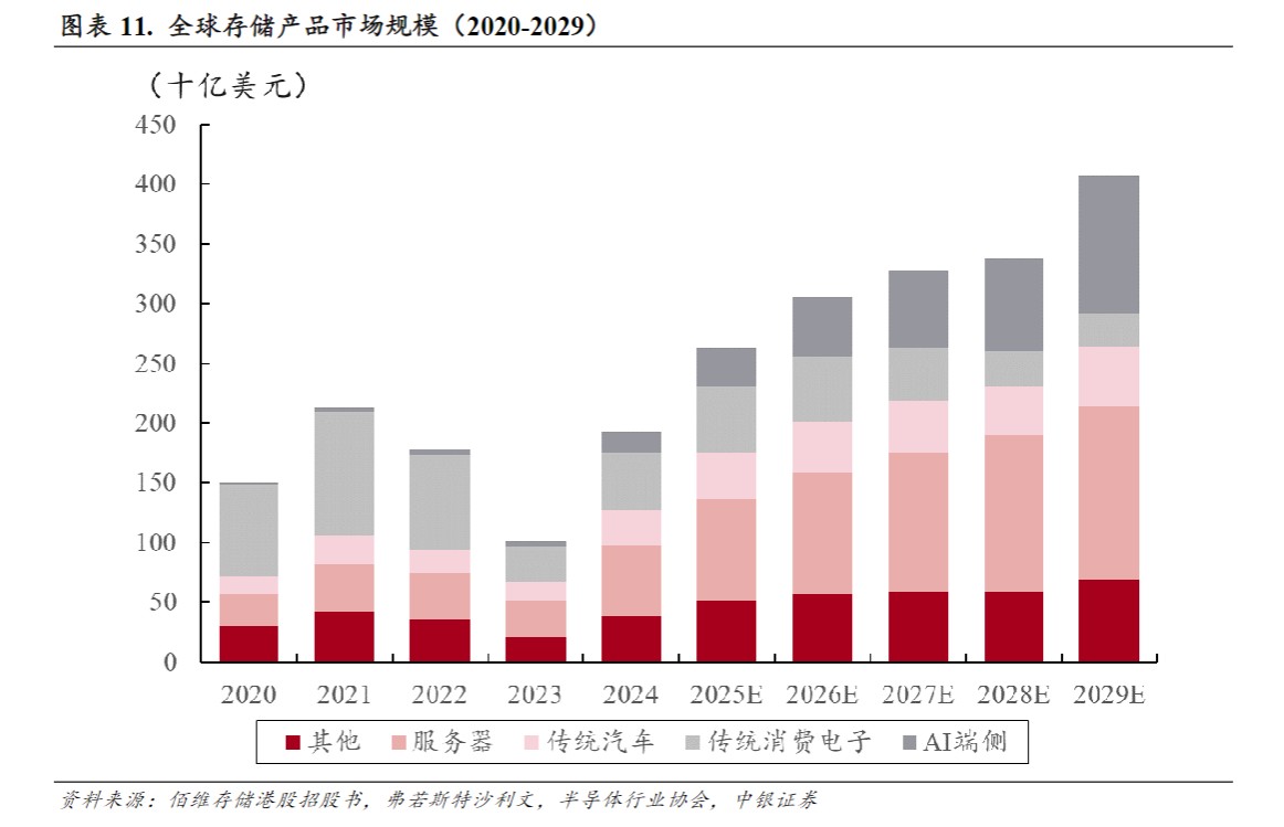 存储产品长期增长态势稳健。佰维存储港股招股书显示,2020年全球市场规模1499亿美元,期间受数字经济各领域对存储技术需求不断扩大推动,市场规模2024年增至1928亿美元,复合年增长率为6.5%。未来,人工智能融入产业将进一步拓宽存储产品的应用场景,预计2025-2029年全球市场规模将从2633亿美元增至4071亿美元,期间复合年增长将达到11.5%。