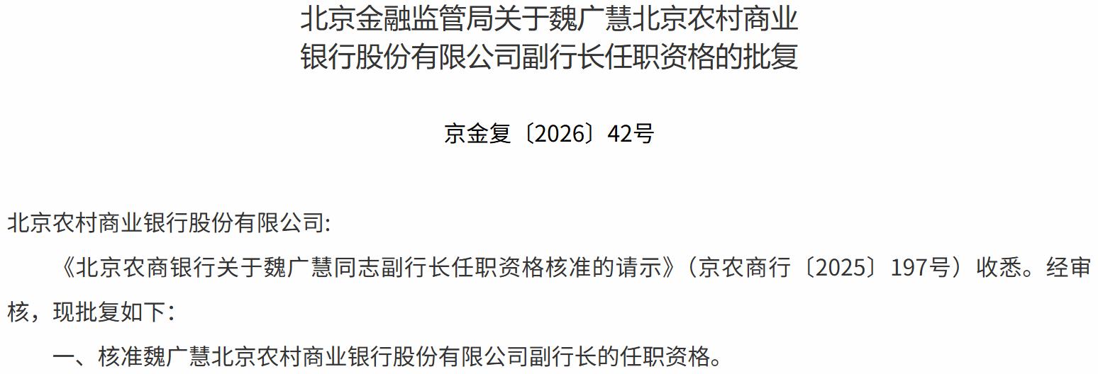 1月23日,北京金融监管局发布《关于魏广慧北京农村商业银行股份有限公司副行长任职资格的批复》,核准魏广慧北京农村商业银行股份有限公司(以下简称“北京农商行”)副行长的任职资格。