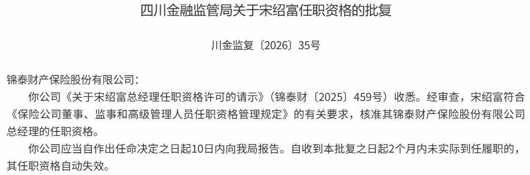 1月27日,四川金融监管局发布任职批复,核准宋绍富锦泰财产保险股份有限公司(以下简称“锦泰财险”,870026.NQ)总经理的任职资格。