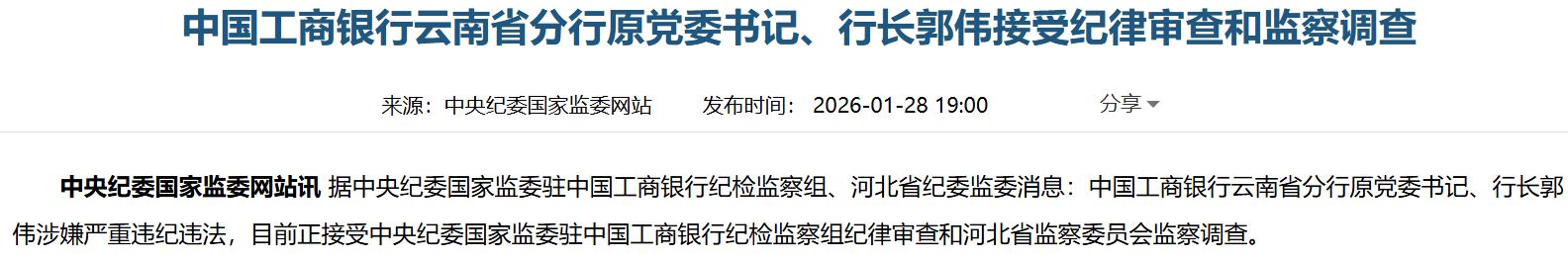 1月28日,据中央纪委国家监委驻中国工商银行纪检监察组、河北省纪委监委消息,中国工商银行云南省分行原党委书记、行长郭伟涉嫌严重违纪违法,目前正接受中央纪委国家监委驻中国工商银行纪检监察组纪律审查和河北省监察委员会监察调查。
