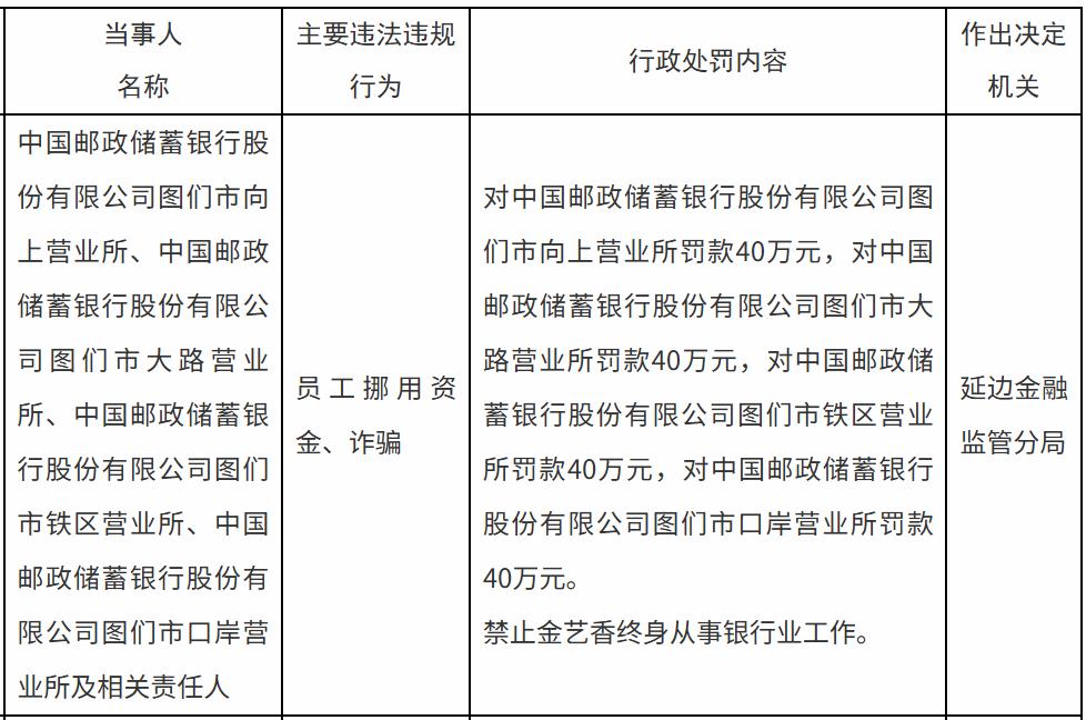 1月29日,延边金融监管局发布的行政处罚信息表显示,中国邮政储蓄银行股份有限公司图们市向上营业所、图们市大路营业所、图们市铁区营业所、图们市口岸营业所存在员工挪用资金、诈骗等违法违规行为,上述4个营业所分别被处罚款40万元。同时相关责任人金艺香被终身禁止从事银行业工作。