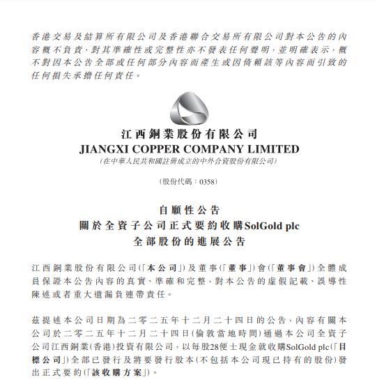 值得一提的是,此次收购也并非一帆风顺。据此前公告,江西铜业曾于2025年11月23日及28日两次向索尔黄金董事会提交非约束性现金要约(最新一次报价为每股26便士),但均遭拒绝。面对阻力,江西铜业选择加价推进,于12月24日发出正式要约,最终将报价提升至每股28便士,成功获得标的董事会认可。