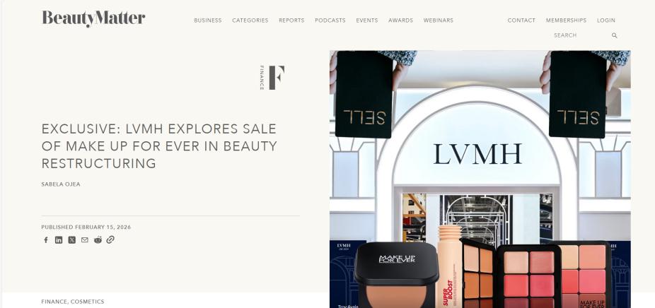 据外媒BeautyMatter报道,LVMH集团正考虑出售旗下彩妆品牌 Make Up For Ever(玫珂菲),作为其美妆业务重组的一部分。