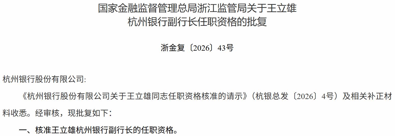 2月25日,国家金融监督管理总局浙江监管局发布批复,核准王立雄杭州银行副行长的任职资格。