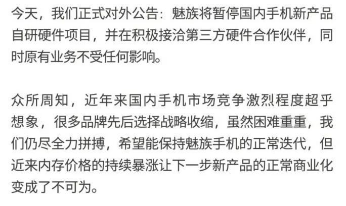 魅族科技在公告中称,近年来国内手机市场竞争激烈程度超乎想象,很多品牌先后选择战略收缩,虽然困难重重,我们仍尽全力拼搏,希望能保持魅族手机的正常迭代,但近来内存价格的持续暴涨让下一步新产品的正常商业化变成了不可为。