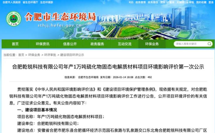合肥乾锐科技年产1万吨硫化物固态电解质项目环评公示,该项目主产品包括锂磷硫氯(2000吨/年)、锂磷硫氯溴(6000吨/年)、锂磷硫氯碘(2000吨/年),全面覆盖硫化物固态电解质的主流材料体系。