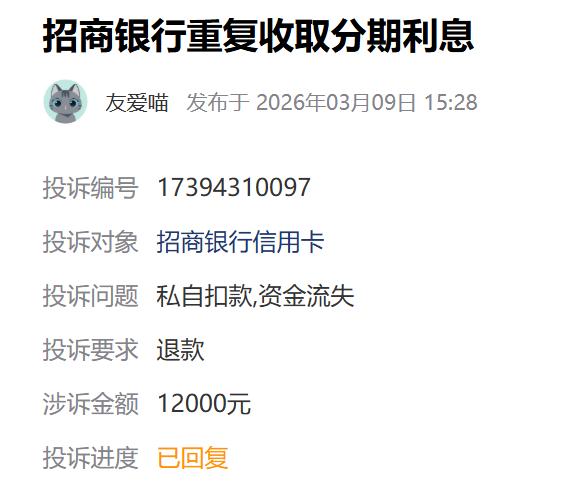 还有用户投诉表示,最近发现招商银行有额外重复收取用户两张银行卡分期账单利息的问题,而且持续1-2年,金额超万元。