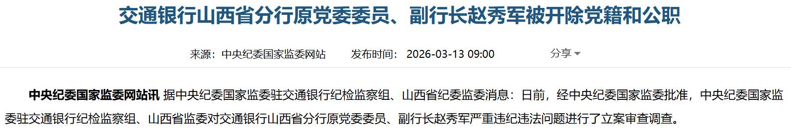 3月13日,据中央纪委国家监委驻交通银行纪检监察组、山西省纪委监委消息,经中央纪委国家监委批准,中央纪委国家监委驻交通银行纪检监察组、山西省监委对交通银行山西省分行原党委委员、副行长赵秀军严重违纪违法问题进行了立案审查调查。