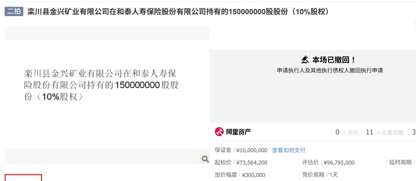 近期,阿里资产拍卖平台信息显示,原本定于3月13日开启二次司法拍卖的栾川县金兴矿业所持和泰人寿1.5亿股份(10%股权),目前已被撤拍。据了解,本次撤拍前,该笔股权二拍的起拍价降至7356.42万元,较首次拍卖打8折。