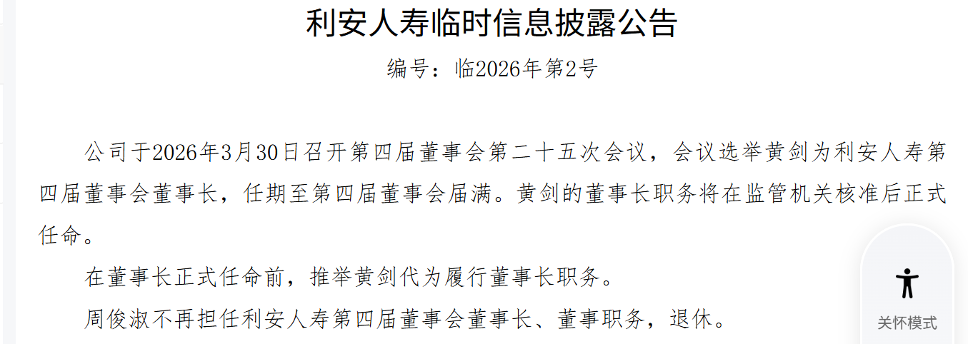 3月30日,利安人寿发布公告称,于2026年3月30日召开第四届董事会第二十五次会议,会议选举黄剑为利安人寿第四届董事会董事长,任期至第四届董事会届满。黄剑的董事长职务将在监管机关核准后正式任命。在董事长正式任命前,推举黄剑代为履行董事长职务。周俊淑退休后不再担任利安人寿第四届董事会董事长、董事职务。