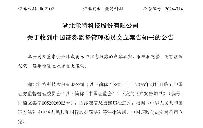 4月1日,能特科技(002102.SZ)发布公告称,收到中国证监会下发的《立案告知书》,因涉嫌信息披露违法违规,根据法律法规,中国证监会决定对能特科技立案。