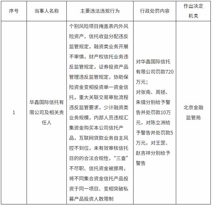 华鑫信托被罚款720万元 个别风险项目掩盖表内外风险资产