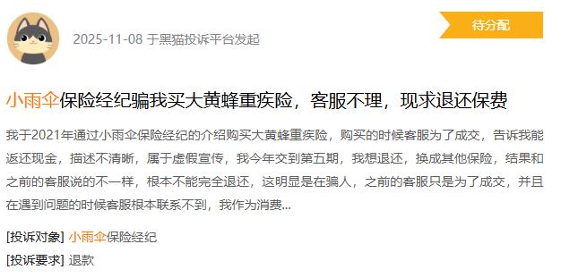 不仅如此,消费者还频频对小雨伞发起投诉。黑猫投诉平台显示,消费者反映,于2021年通过小雨伞介绍购买大黄蜂重疾险,购买的时候客服为了成交,告诉消费者能返还现金,描述不清晰,属于虚假宣传,2025年交到第五期,消费者想退还,换成其他保险,结果和之前的客服说的不一样,根本不能完全退还,之前的客服只是为了成交,并且在遇到问题的时候客服根本联系不到,作为消费者,利益受损害,并且他们不处理,所以想要投诉,希望钱得到返还。