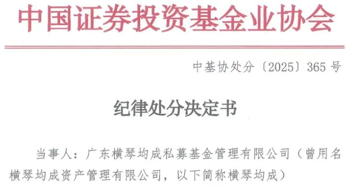 3月27日,中基协披露关于广东横琴均成私募基金管理有限公司(以下简称“横琴均成”)的纪律处分决定书。