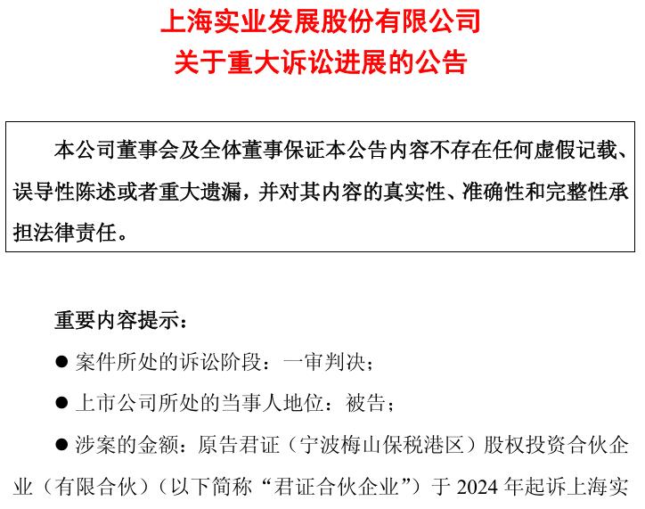 4月4日,上实发展发布公告称,原告君证(宁波梅山保税港区)股权投资合伙企业(有限合伙)(以下简称“君证合伙企业”)于2024年起诉上实发展及其他被告,涉案金额约为8.01亿元,后在诉讼过程中变更诉讼请求,调整后的诉讼金额约为4.31亿元。公司于近期收到上海金融法院送达的《民事判决书》[(2024)沪74民初754号],法院根据本次诉讼的相关证据,认为原告的投资决定与案涉虚假陈述之间的交易因果关系并不成立,无权要求被告赔偿其投资损失。