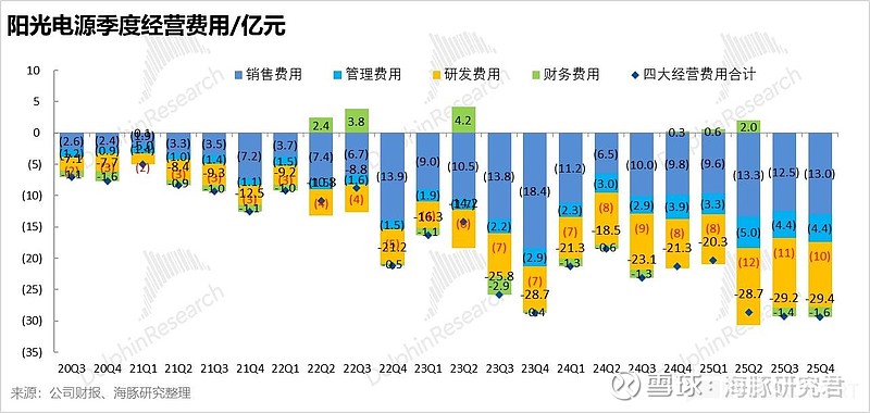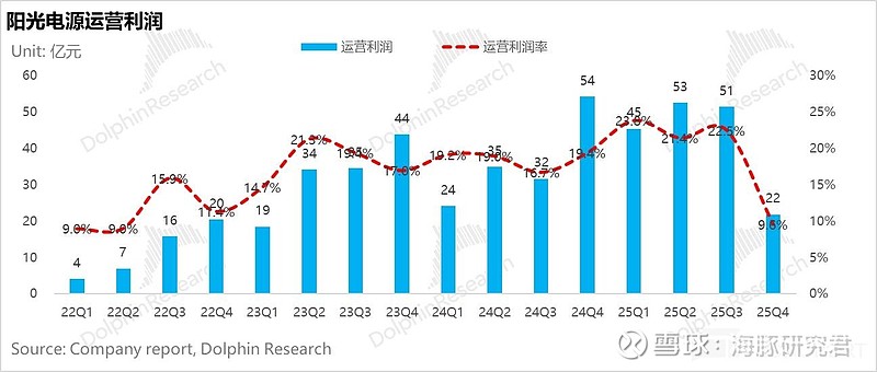 营收失速叠加出海与新业务 “刚性支出”,反向杠杆急剧放大:为打造 “第三增长曲线” 加码 AIDC 电源与下一代储能技术,Q4 研发费用同比大幅提升 31.3% 至 10.3 亿;为铺设全球网络,销售费用近 13 亿,同比提升 32%。在毛利骤降与费用双高挤压下,Q4 运营利润同比暴跌近 60%。
