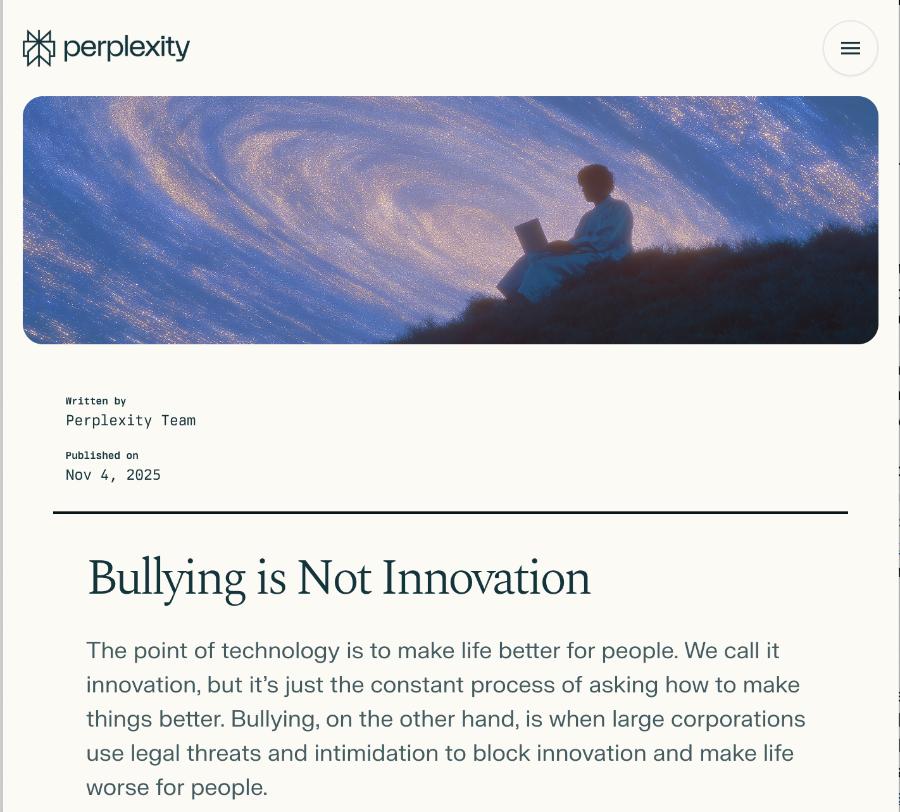 ▲Perplexity在博客更新《霸凌不是创新》,称亚马逊为「霸凌者」