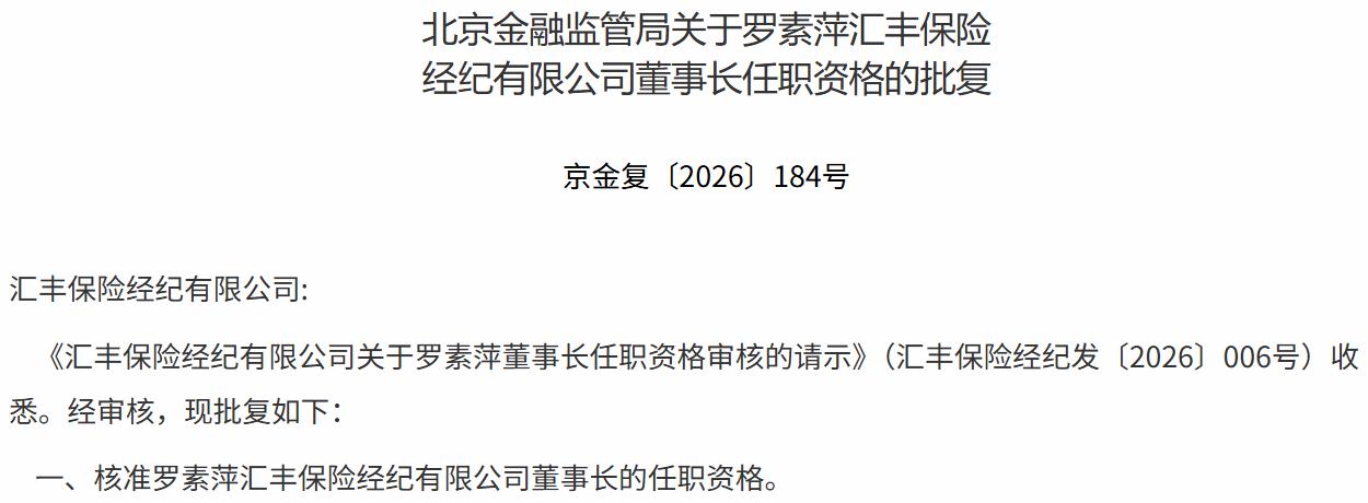 4月10日,北京金融监管局发布任职批复,核准罗素萍汇丰保险经纪有限公司(以下简称“汇丰保险经纪”)董事长的任职资格。