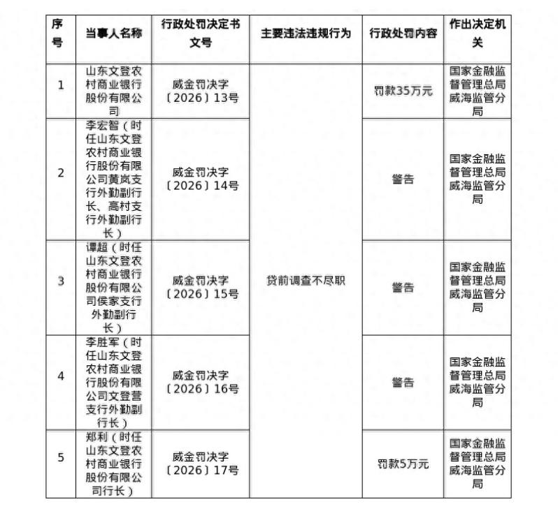 山东文登农商行被罚35万元,涉贷前调查不尽职