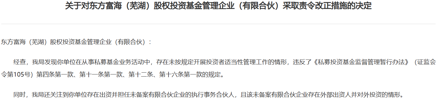 安徽证监局指出,东方富海在从事私募基金业务活动中,存在未按规定开展投资者适当性管理工作的情形,同时,东方富海存在出资并担任未备案有限合伙企业的执行事务合伙人,且该未备案有限合伙企业存在外部出资人并对外投资的情形。