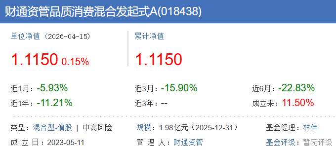 在资产净值大幅增长的同时,财通资管品质消费混合发起式基金的业绩表现却不理想。截至2026年4月15日,该基金A类份额近1年的单位净值下跌11.21%,近6个月的单位净值下跌22.83%,尤其是近3个月的单位净值下跌15.9%,与投资者反映情况相符。