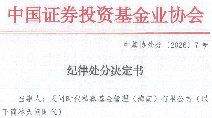 4月17日,中基协发布关于天问时代私募基金管理(海南)有限公司(以下简称“天问时代”)的纪律处分决定书。