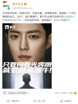 截至1月22日,蒙牛乳业官宣代言人的微博已经有100万+转发、32.7万条评论、244万点赞,而蒙牛乳业在此之前的微博转发数量仅有几十,甚至个位数。