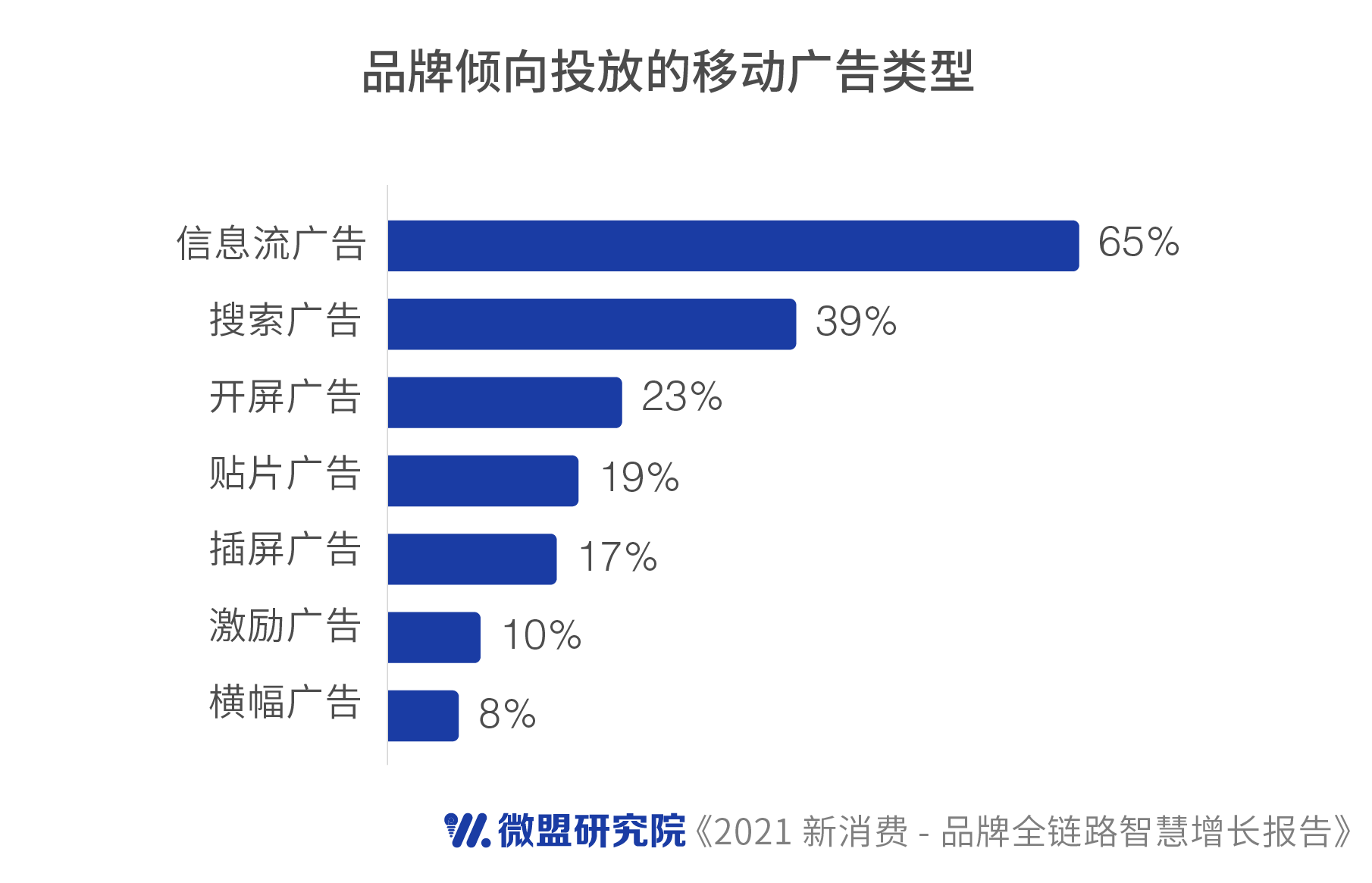 以新消费典型行业“零售、电商”为例,据《微盟报告》显示,零售、电商行业的效果广告的规模占比达83%、92%——其中,精准投放能力强的广告类型更容易收到品牌方的青睐,因此在各种广告类型中,由于信息流广告能够通过大数据和AI技术实现精准投放,效果评估更为精准,是品牌方最愿意选择的广告类型,有65%的品牌倾向于信息流广告;倾向于搜索广告和开屏广告的品牌则分别为39%、23%,虽然仅次于信息流广告,但倾向程度已经大打折扣;只有8%的品牌还愿意选择最传统的横幅广告。